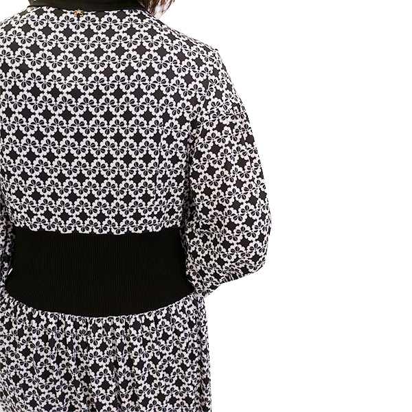 レトロ柄のジャージ素材がおしゃれなウェストニット切替ボウタイデザインのロングブラウスが新登場!