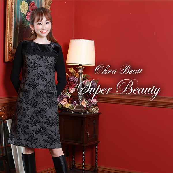 【SuperBeauty 】フロッキープリントベロア切替ワンピース [1102426022]