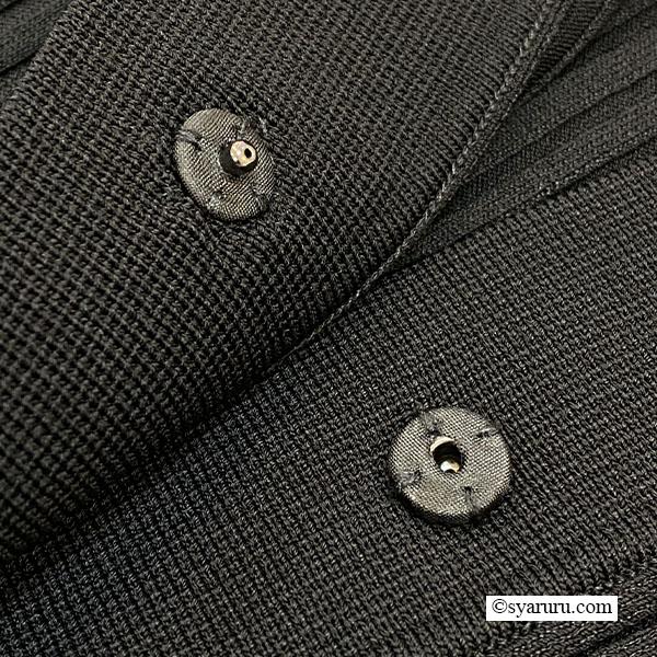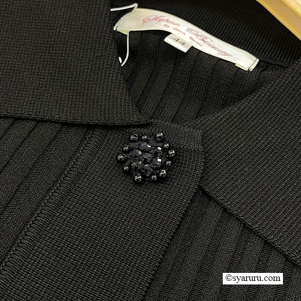 襟付きデザインがきちんと感を演出しつつ、ビジューボタンが華やかさを添えて、シンプルながらも印象的なスタイルに。