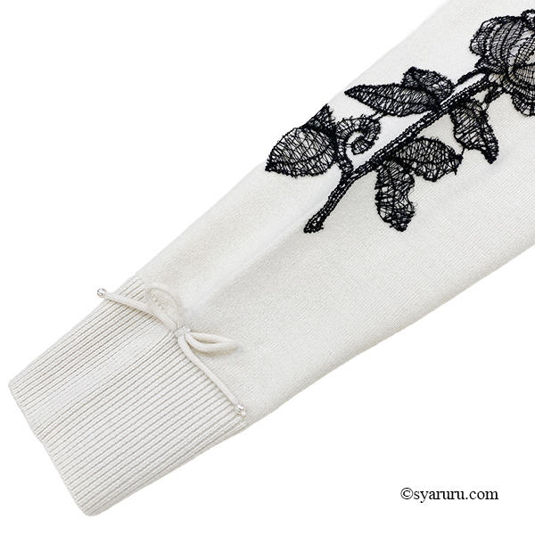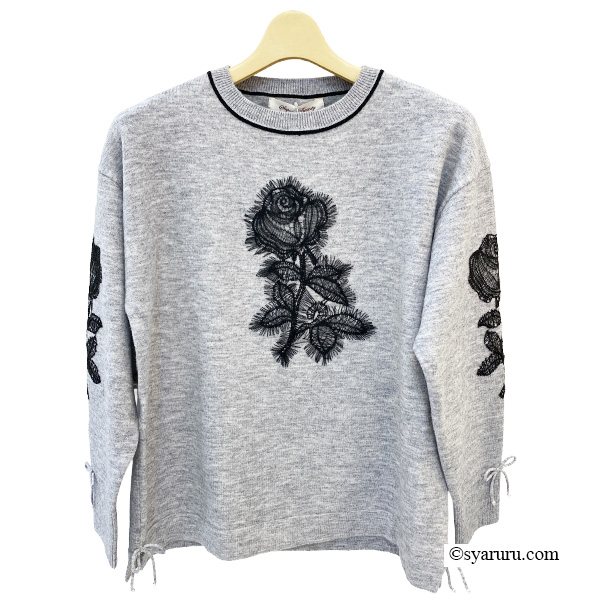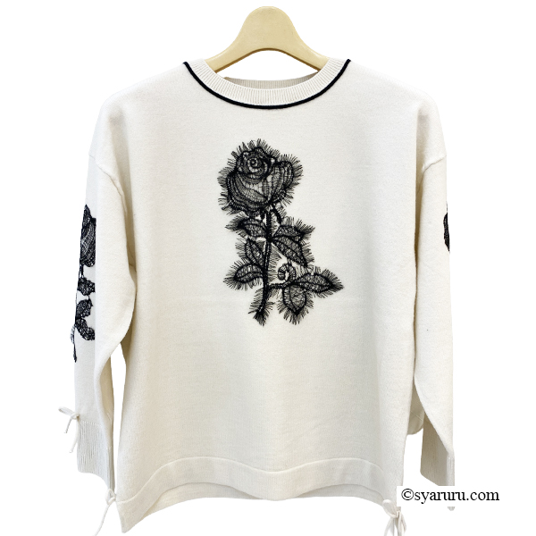 「花レース使い配色セーター」は、胸元と袖にあしらわれた繊細な花レースが印象的な、エレガントさ漂う大人のためのニットトップスです。