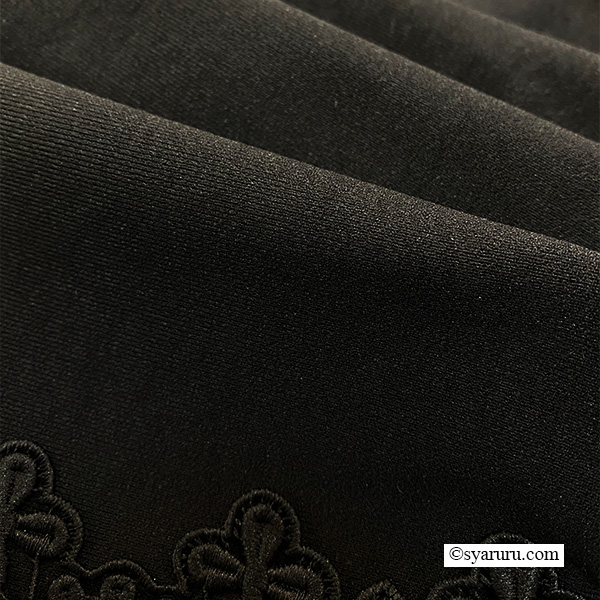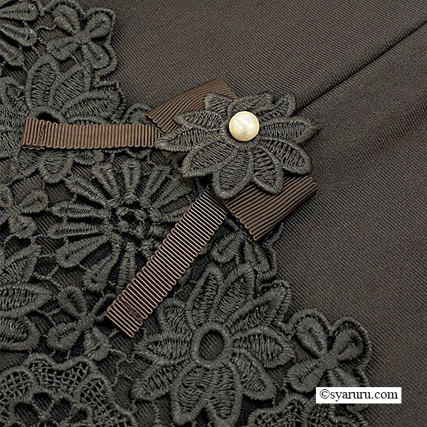 裾サイドには、華やかな花とリボンモチーフをあしらい、シンプルなシルエットに女性らしいアクセントをプラス。