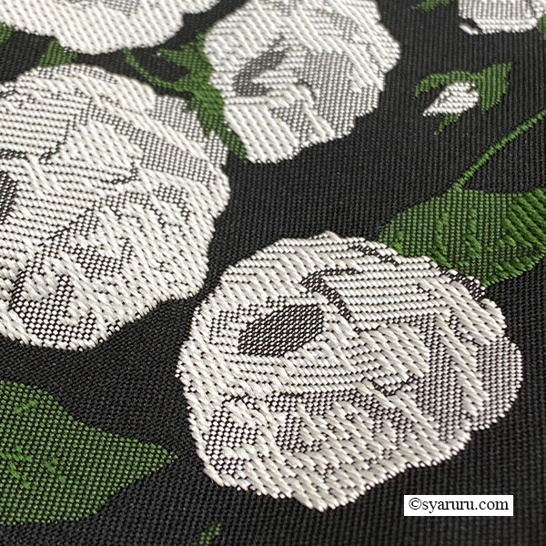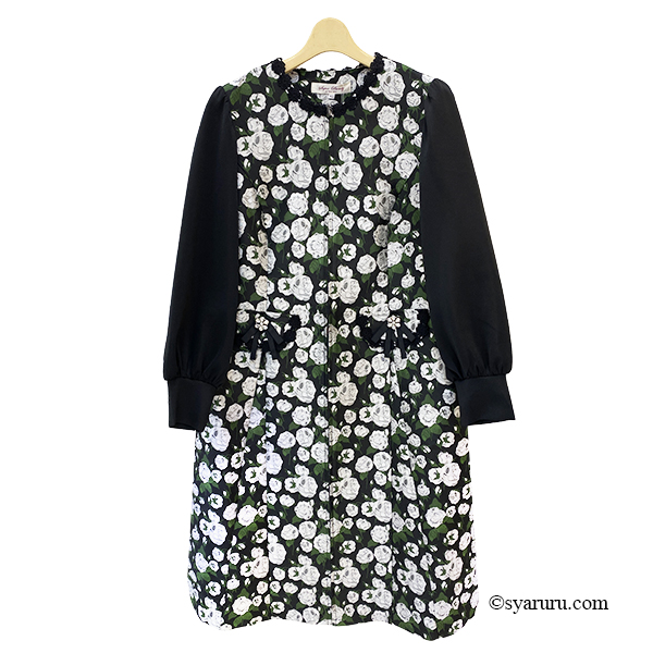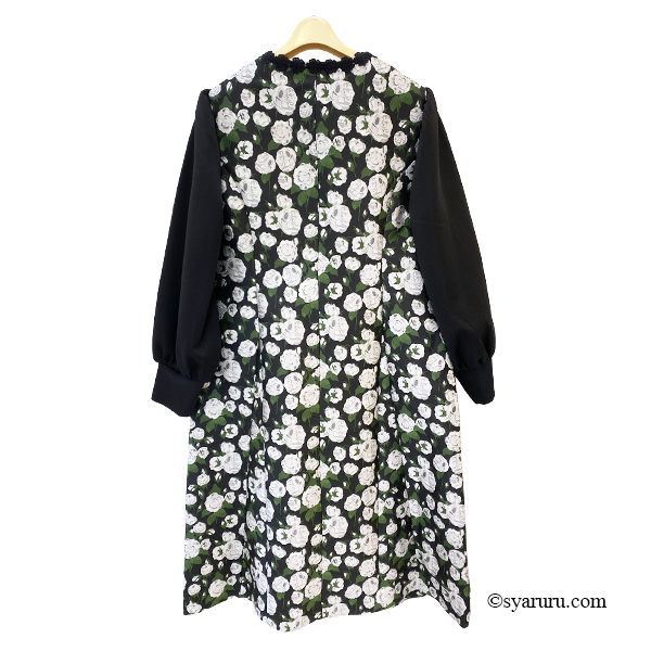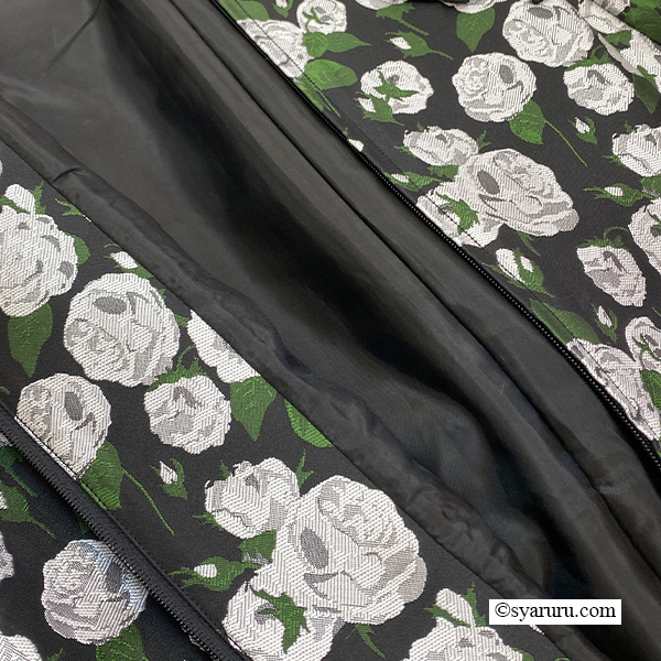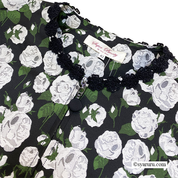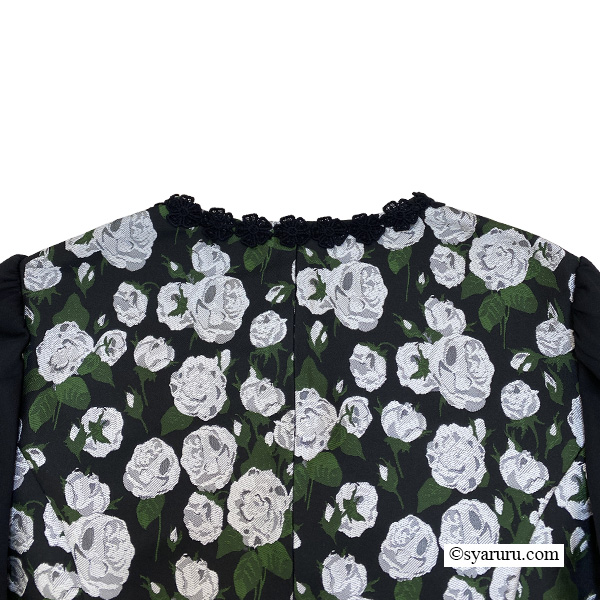 目を引くのは、前身頃にあしらわれた花柄のジャガード織。