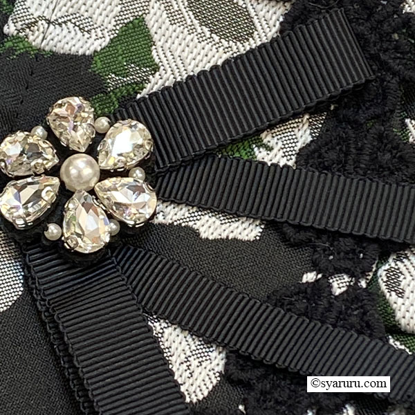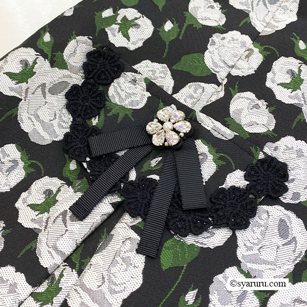 さらに、飾りポケットには同じレースに加えて、ビジューとリボンの装飾を添え、細部にまでこだわった華やかさを演出。