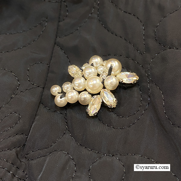 胸元にあしらわれたビジューは、光の加減でさりげなく輝き、上品なアクセントとして視線を集めます。