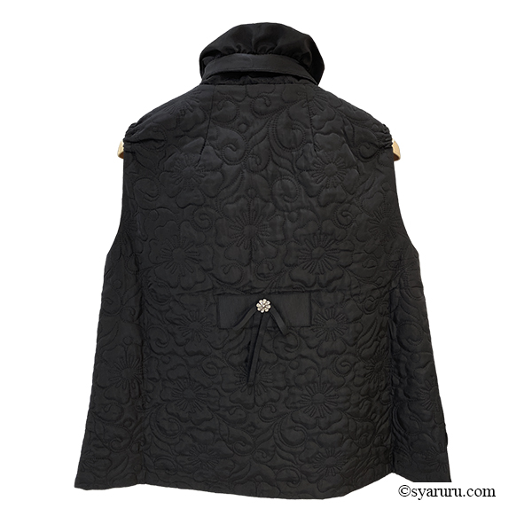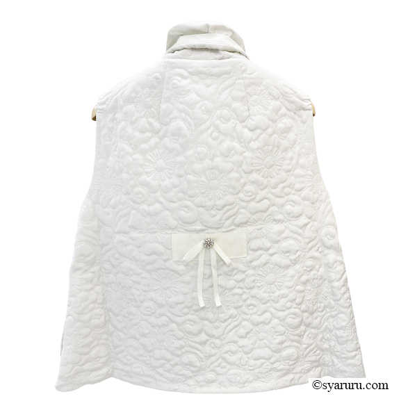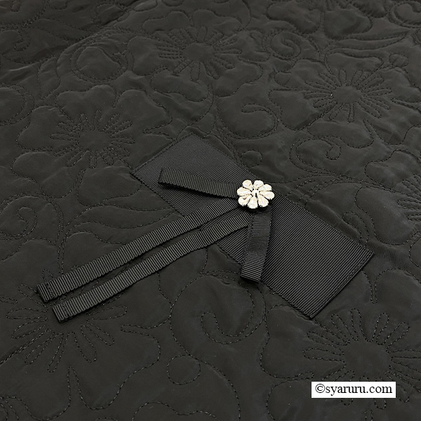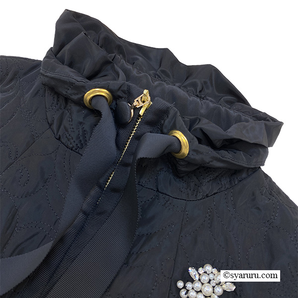 スタンドカラーが首元をすっきりと見せ、洗練された印象を演出。襟元にはグログランリボンのデザインが施されており、シンプルな中にも華やかさを添えています。