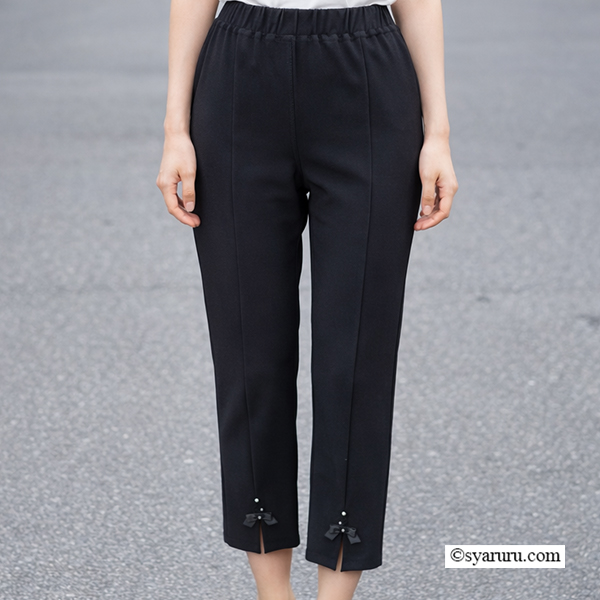 裾前スリットとリボンディテールが、さりげなく女性らしさを添える一本。