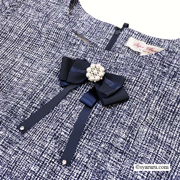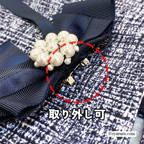 胸元には可憐なリボン型コサージュをプラスし、華やぎをひとさじ。