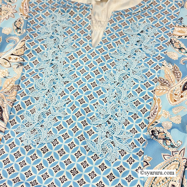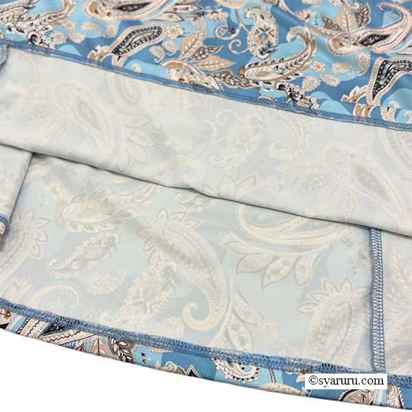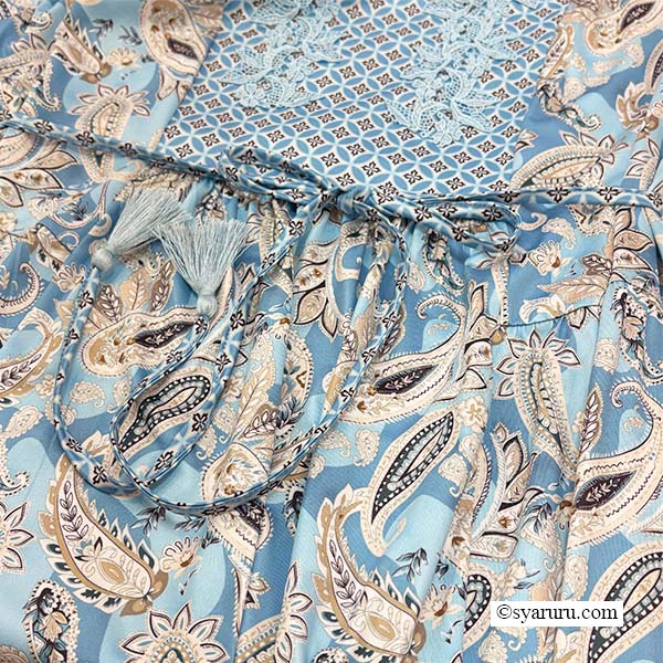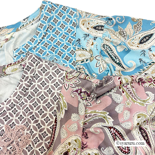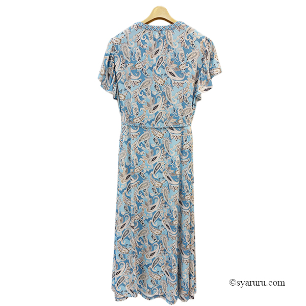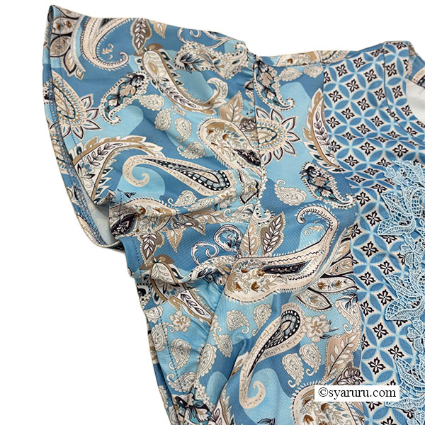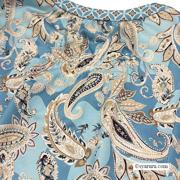 異国情緒あふれるオリエンタル調のペイズリープリントに、胸元の繊細なレースとキーネックデザインが上品な抜け感を演出し、女性らしさを一層引き立てます。