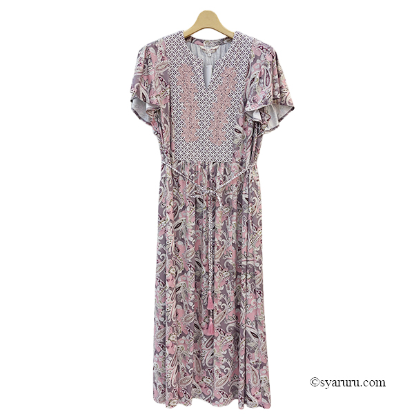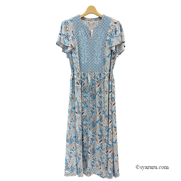 【《新作》SuperBeauty クーポン1111(10%OFF)他 利用可】胸元レースxスリット入りペイズリー柄切替ワンピース [1102616032]